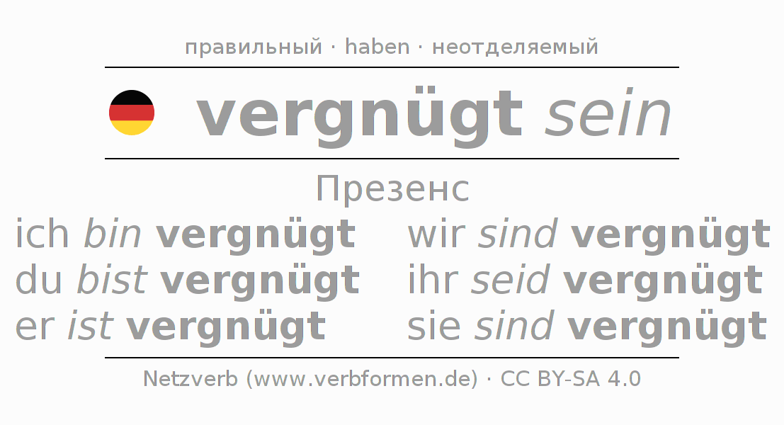 Спряжение vergnügen в Презенс Индикатив Настоящее время Пассив с sein: ich bin vergnügt, du bist vergnügt, er ist vergnügt, wir sind vergnügt, ihr seid vergnügt, sie sind vergnügt.Образование этих форм происходит по определённым грамматическим правилам. Так же спрягаются простые глагольные формы vergnügen в Презенс. Kомментарии ☆