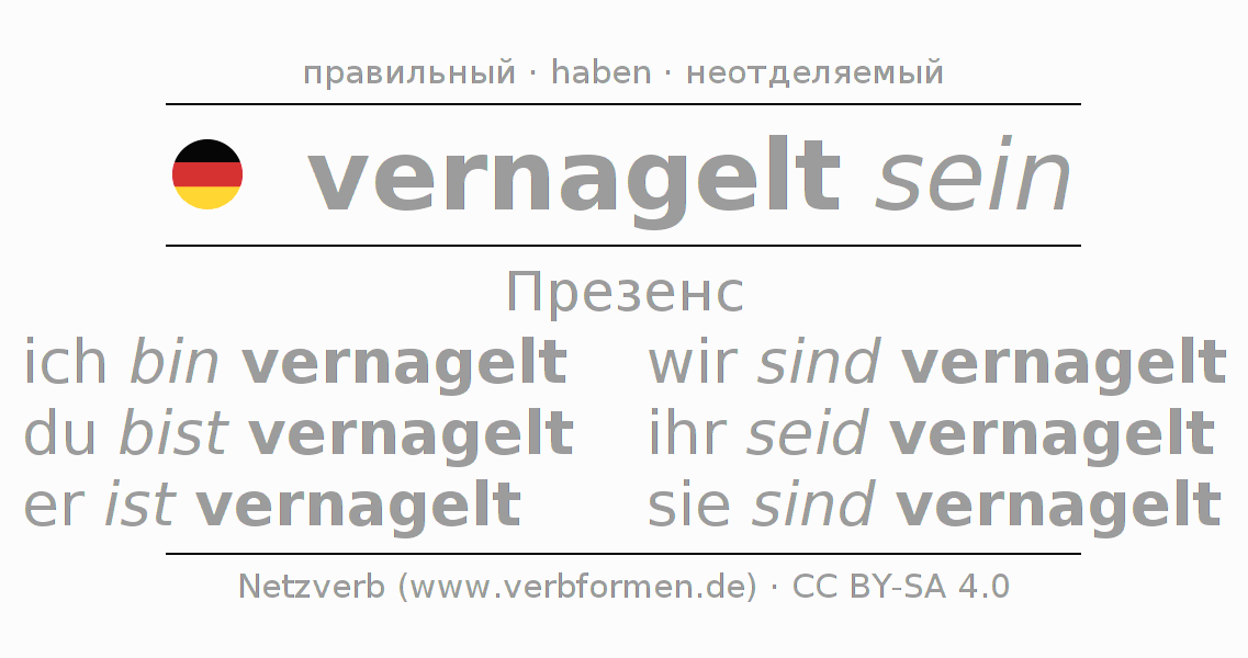 Спряжение vernageln в Презенс Индикатив Настоящее время Пассив с sein: ich bin vernagelt, du bist vernagelt, er ist vernagelt, wir sind vernagelt, ihr seid vernagelt, sie sind vernagelt.Образование этих форм происходит по определённым грамматическим правилам. Так же спрягаются простые глагольные формы vernageln в Презенс. Kомментарии ☆