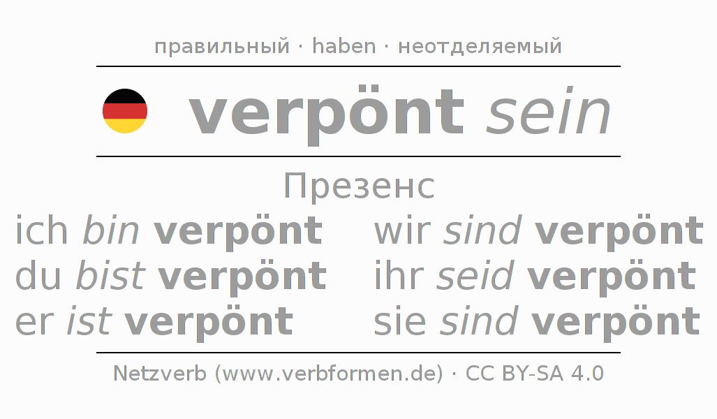 Спряжение verpönen в Презенс Индикатив Настоящее время Пассив с sein: ich bin verpönt, du bist verpönt, er ist verpönt, wir sind verpönt, ihr seid verpönt, sie sind verpönt.Образование этих форм происходит по определённым грамматическим правилам. Так же спрягаются простые глагольные формы verpönen в Презенс. Kомментарии ☆
