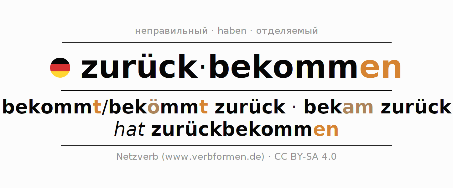 Спряжение zurückbekommen (получать обратно, получить обратно) в настоящем времени Презенс: ich bekomme zurück, du bekommst/bekömmst zurück, er bekommt/bekömmt zurück, wir bekommen zurück, ihr bekommt zurück, sie bekommen zurück