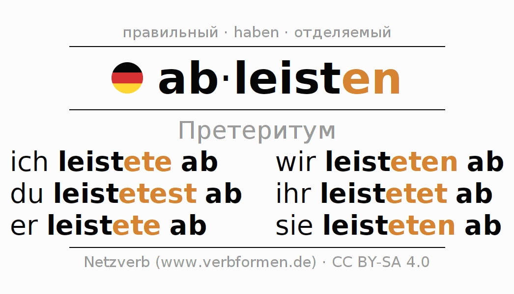 Спряжение ableisten (отбывать, выполнять обязательство) в прошедшем времени претерит: ich leistete ab, du leistetest ab, er leistete ab, wir leisteten ab, ihr leistetet ab, sie leisteten ab.