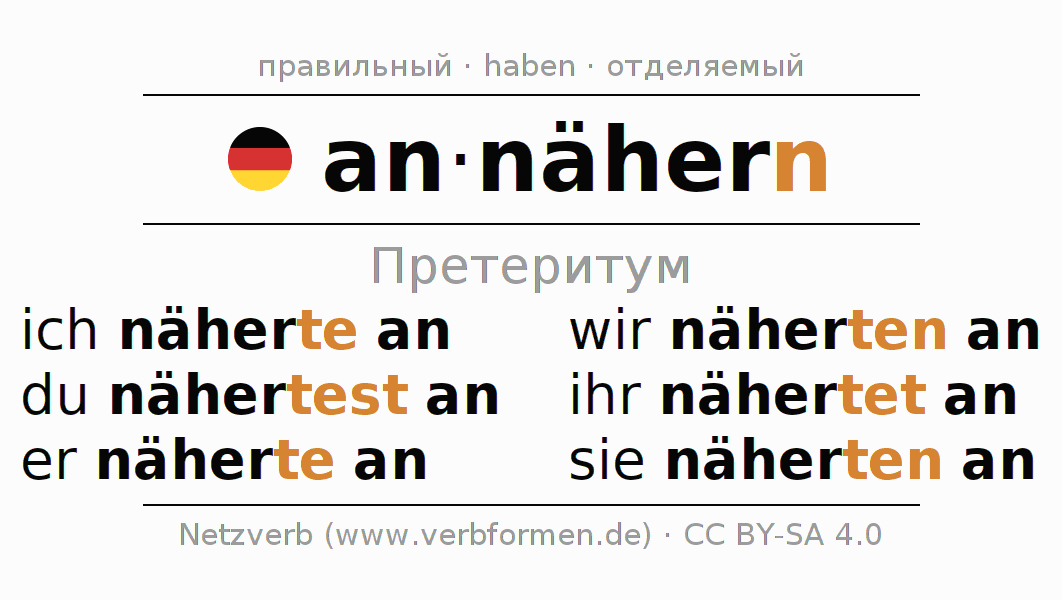 Спряжение annähern (приближаться, приближать) в прошедшем времени претерит: ich näherte an, du nähertest an, er näherte an, wir näherten an, ihr nähertet an, sie näherten an.