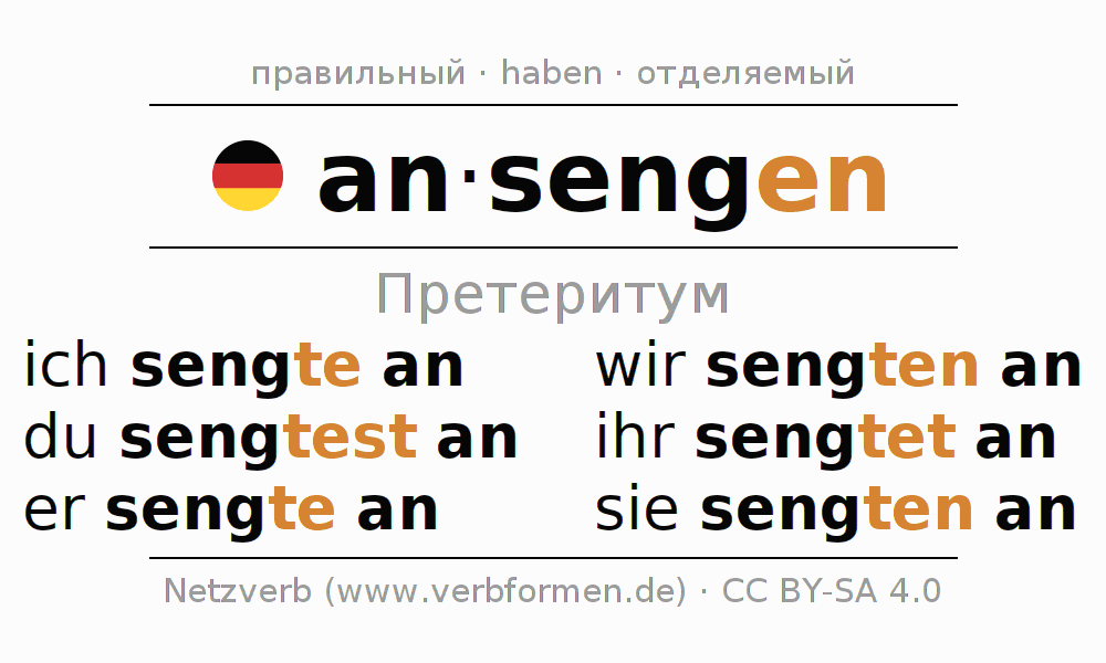 Спряжение ansengen (обжигать, подгорать) в прошедшем времени претерит: ich sengte an, du sengtest an, er sengte an, wir sengten an, ihr sengtet an, sie sengten an.