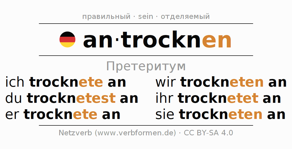 Спряжение antrocknen (присохнуть, сохнуть) в прошедшем времени претерит: ich trocknete an, du trocknetest an, er trocknete an, wir trockneten an, ihr trocknetet an, sie trockneten an.