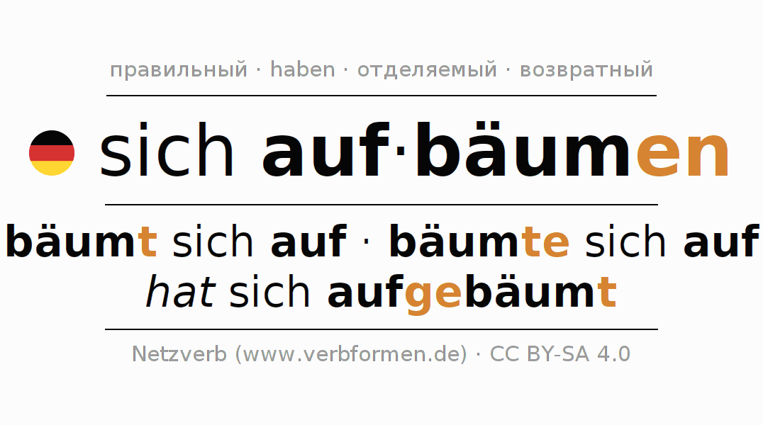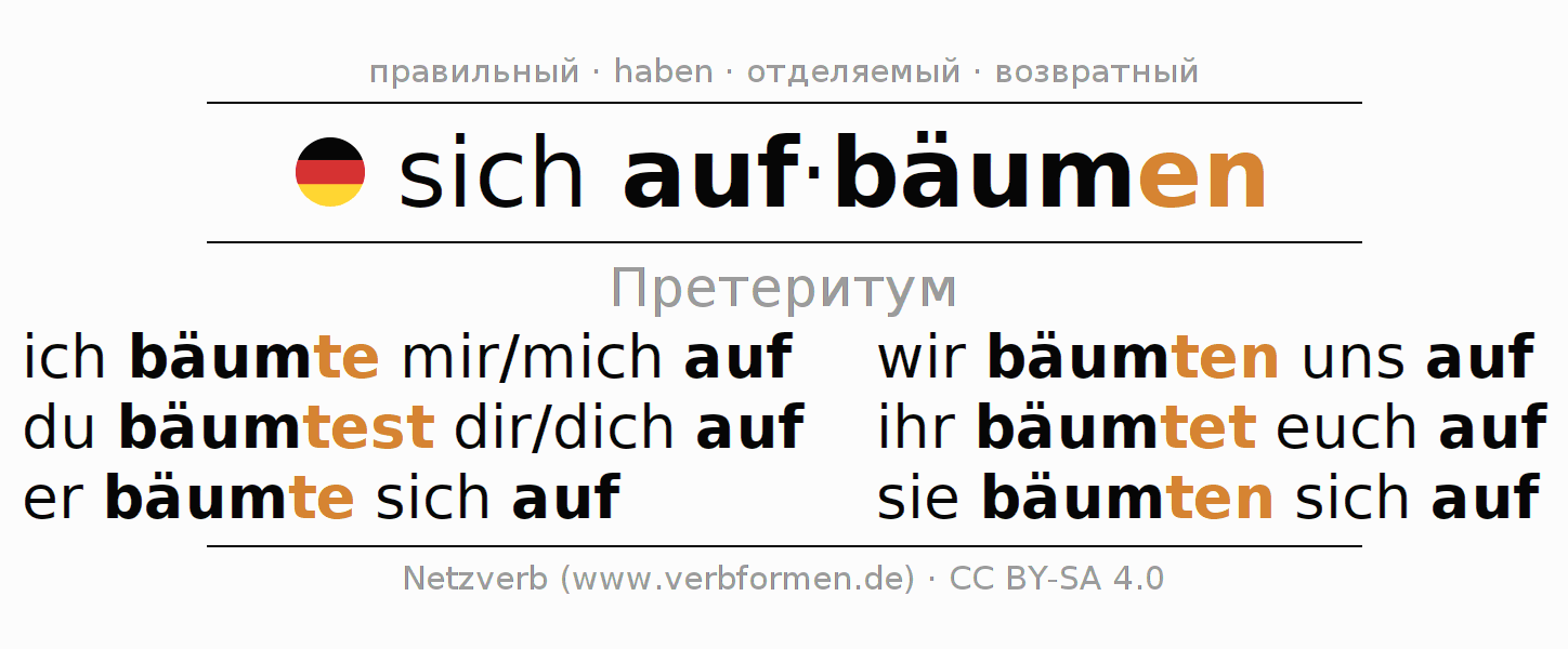 Спряжение sich aufbäumen (восставать, противиться) в прошедшем времени претерит: ich bäumte mir/mich auf, du bäumtest dir/dich auf, er bäumte sich auf, wir bäumten uns auf, ihr bäumtet euch auf, sie bäumten sich auf.