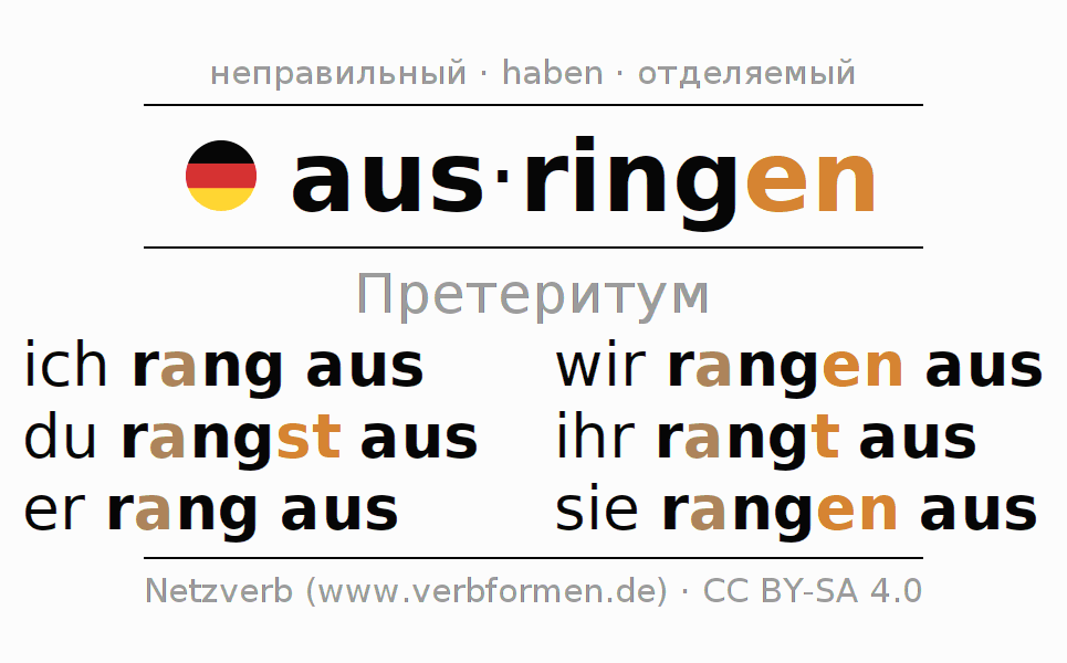 Спряжение ausringen (выжимать, выжать) в прошедшем времени претерит: ich rang aus, du rangst aus, er rang aus, wir rangen aus, ihr rangt aus, sie rangen aus.
