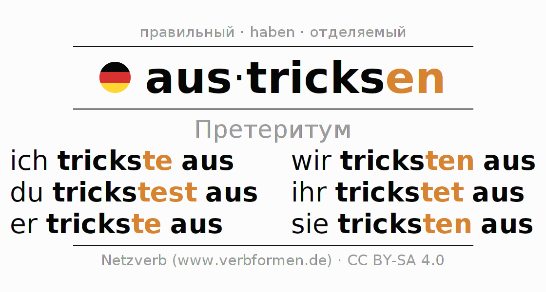 Спряжение austricksen (провести, обмануть) в прошедшем времени претерит: ich trickste aus, du trickstest aus, er trickste aus, wir tricksten aus, ihr trickstet aus, sie tricksten aus.
