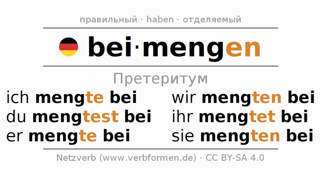 Спряжение beimengen (вмешивать, добавлять) в прошедшем времени претерит: ich mengte bei, du mengtest bei, er mengte bei, wir mengten bei, ihr mengtet bei, sie mengten bei.