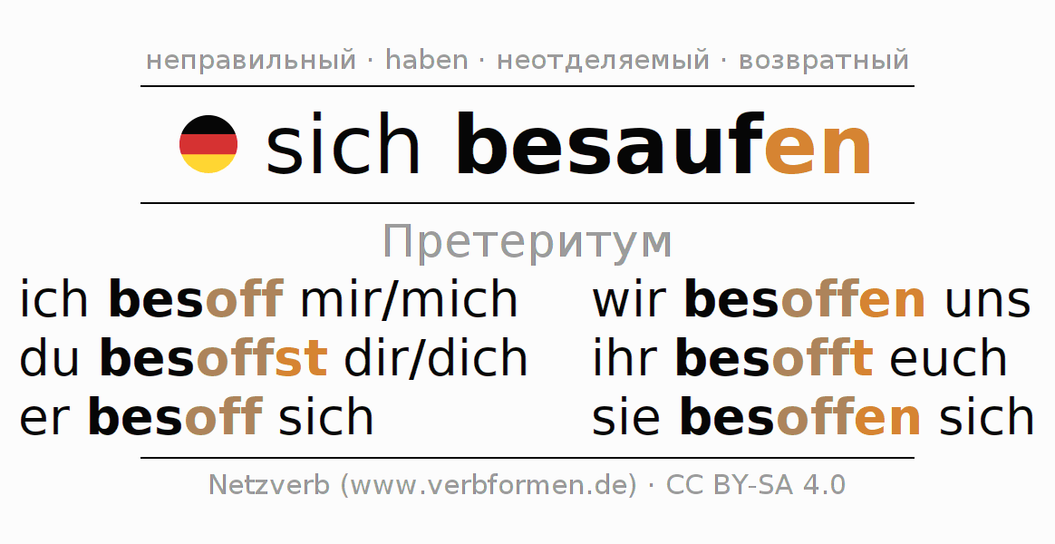 Спряжение sich besaufen (напиваться, напиться) в прошедшем времени претерит: ich besoff mir/mich, du besoffst dir/dich, er besoff sich, wir besoffen uns, ihr besofft euch, sie besoffen sich.