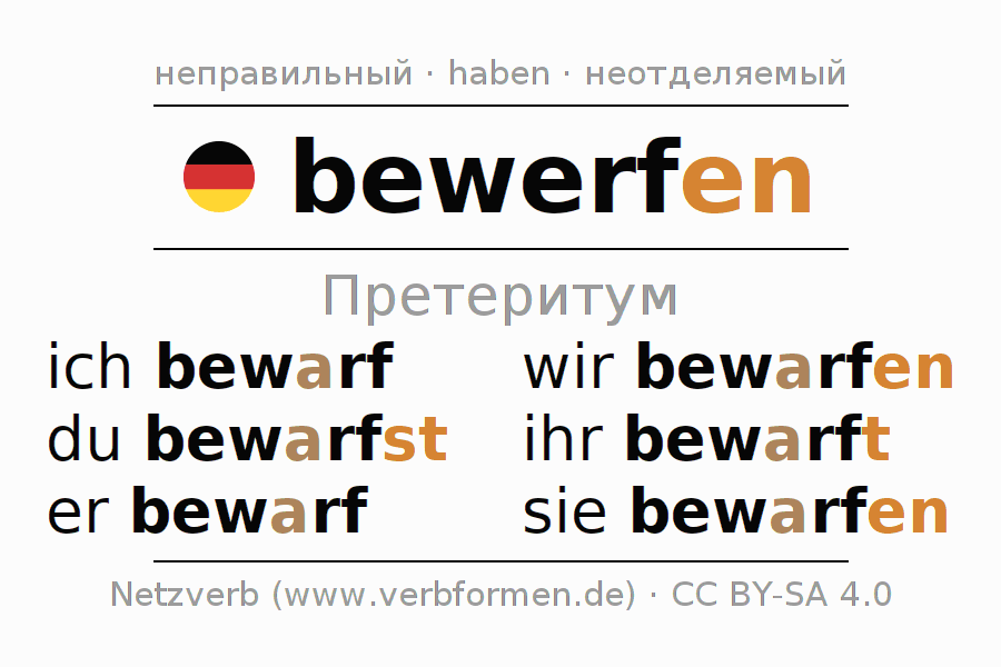 Спряжение bewerfen (бросать, бросаться) в прошедшем времени претерит: ich bewarf, du bewarfst, er bewarf, wir bewarfen, ihr bewarft, sie bewarfen.