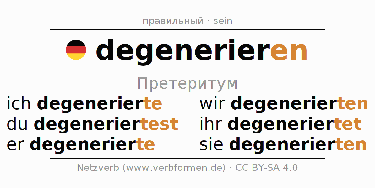 Спряжение degenerieren (дегенерировать, атрофироваться) в прошедшем времени претерит: ich degenerierte, du degeneriertest, er degenerierte, wir degenerierten, ihr degeneriertet, sie degenerierten.