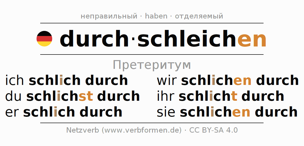 Спряжение durchschleichen (прокрасться, прокрадываться) в прошедшем времени претерит: ich schlich durch, du schlichst durch, er schlich durch, wir schlichen durch, ihr schlicht durch, sie schlichen durch.