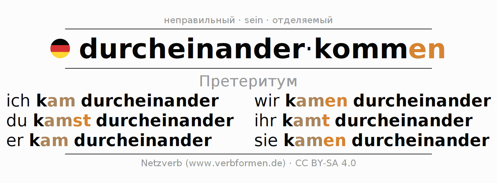 Спряжение durcheinanderkommen (перепутаться, путаться) в прошедшем времени претерит: ich kam durcheinander, du kamst durcheinander, er kam durcheinander, wir kamen durcheinander, ihr kamt durcheinander, sie kamen durcheinander.