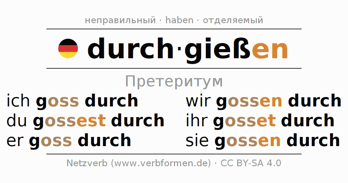 Спряжение durchgießen (заливать, проливать) в прошедшем времени претерит: ich goss durch, du goss(es)t durch, er goss durch, wir gossen durch, ihr goss(e)t durch, sie gossen durch.
