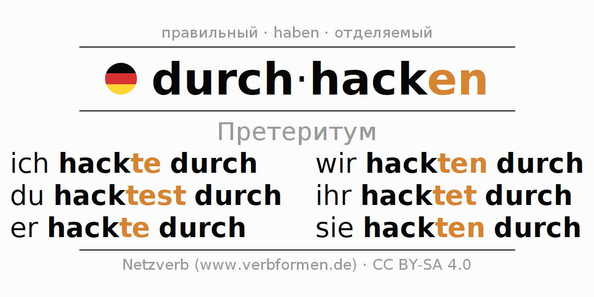 Спряжение durchhacken (разделить, разрубить) в прошедшем времени претерит: ich hackte durch, du hacktest durch, er hackte durch, wir hackten durch, ihr hacktet durch, sie hackten durch.