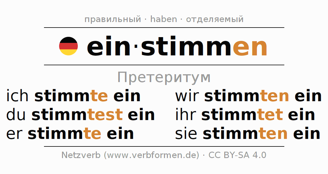 Этот глагол einstimmen полностью спрягается во всех лицах и числах Претеритум Индикатив.
