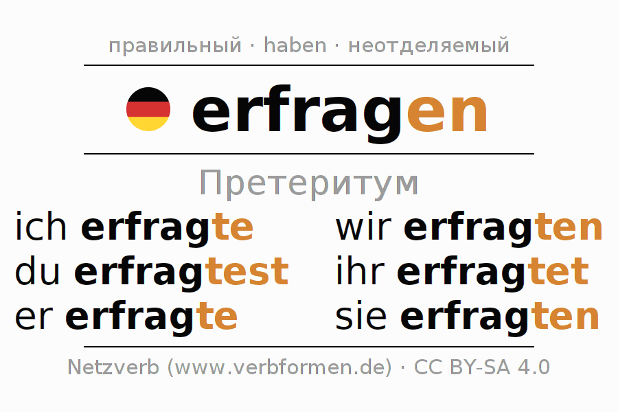 Спряжение erfragen (расспрашивать, спрашивать) в прошедшем времени претерит: ich erfragte, du erfragtest, er erfragte, wir erfragten, ihr erfragtet, sie erfragten.