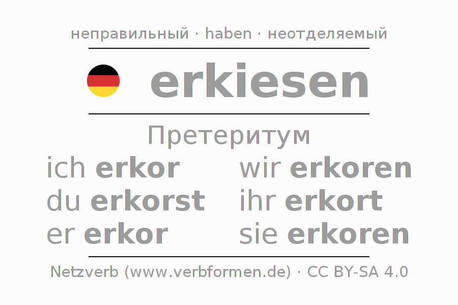Спряжение erkiesen (выбирать, избирать) в прошедшем времени претерит: ich erkor, du erkorst, er erkor, wir erkoren, ihr erkort, sie erkoren.