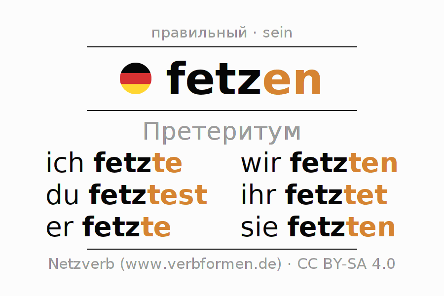 Спряжение fetzen (лететь, мчаться) в прошедшем времени претерит: ich fetzte, du fetztest, er fetzte, wir fetzten, ihr fetztet, sie fetzten.