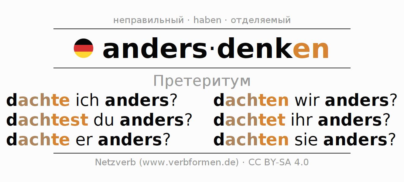 Этот глагол andersdenken полностью спрягается во всех лицах и числах Претеритум Индикатив.