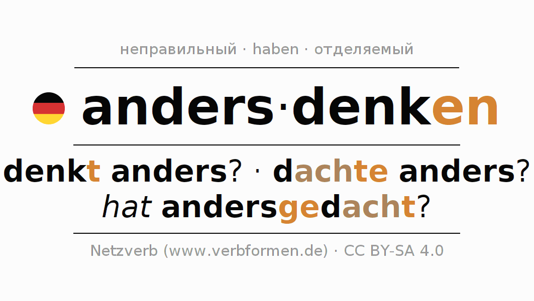 Спряжение andersdenken в Претеритум Индикатив Прошлое время Действительный залог (актив): dachte ich anders?, dachtest du anders?, dachte er anders?, dachten wir anders?, dachtet ihr anders?, dachten sie anders?.Образование этих форм происходит по определённым грамматическим правилам. Так же спрягаются простые глагольные формы andersdenken в Претеритум. Kомментарии ☆