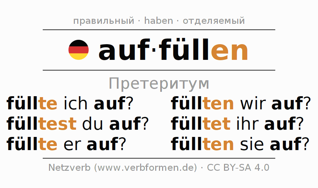 Спряжение auffüllen в Претеритум Индикатив Прошлое время Действительный залог (актив): füllte ich auf?, fülltest du auf?, füllte er auf?, füllten wir auf?, fülltet ihr auf?, füllten sie auf?.Образование этих форм происходит по определённым грамматическим правилам. Так же спрягаются простые глагольные формы auffüllen в Претеритум. Kомментарии ☆