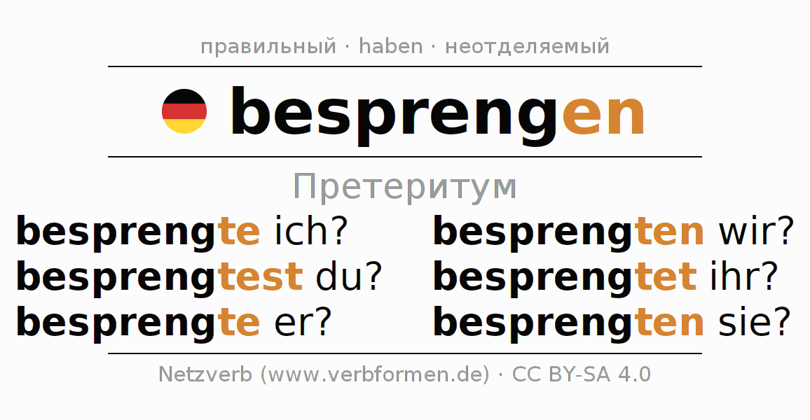 Спряжение besprengen в Претеритум Индикатив Прошлое время Действительный залог (актив): besprengte ich?, besprengtest du?, besprengte er?, besprengten wir?, besprengtet ihr?, besprengten sie?.Образование этих форм происходит по определённым грамматическим правилам. Так же спрягаются простые глагольные формы besprengen в Претеритум. Kомментарии ☆