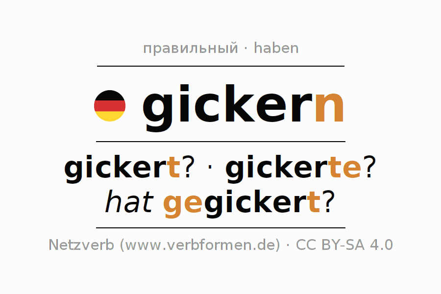 Спряжение gickern в Претеритум Индикатив Прошлое время Действительный залог (актив): gickerte ich?, gickertest du?, gickerte er?, gickerten wir?, gickertet ihr?, gickerten sie?.Образование этих форм происходит по определённым грамматическим правилам. Так же спрягаются простые глагольные формы gickern в Претеритум. Kомментарии ☆