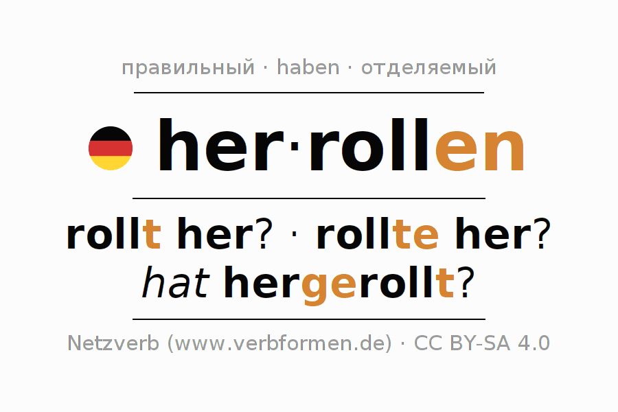 Спряжение herrollen в Претеритум Индикатив Прошлое время Действительный залог (актив): rollte ich her?, rolltest du her?, rollte er her?, rollten wir her?, rolltet ihr her?, rollten sie her?.Образование этих форм происходит по определённым грамматическим правилам. Так же спрягаются простые глагольные формы herrollen в Претеритум. Kомментарии ☆