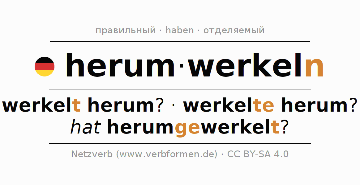 Спряжение herumwerkeln в Претеритум Индикатив Прошлое время Действительный залог (актив): werkelte ich herum?, werkeltest du herum?, werkelte er herum?, werkelten wir herum?, werkeltet ihr herum?, werkelten sie herum?.Образование этих форм происходит по определённым грамматическим правилам. Так же спрягаются простые глагольные формы herumwerkeln в Претеритум. Kомментарии ☆