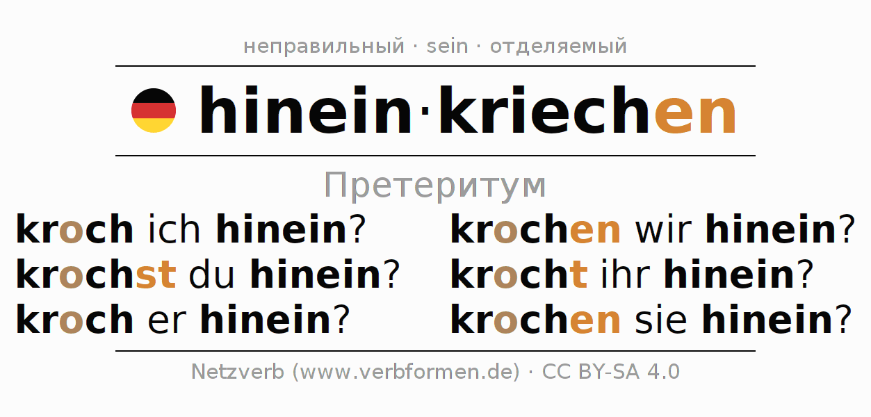 Спряжение hineinkriechen в Претеритум Индикатив Прошлое время Действительный залог (актив): kroch ich hinein?, krochst du hinein?, kroch er hinein?, krochen wir hinein?, krocht ihr hinein?, krochen sie hinein?.Образование этих форм происходит по определённым грамматическим правилам. Так же спрягаются простые глагольные формы hineinkriechen в Претеритум. Kомментарии ☆