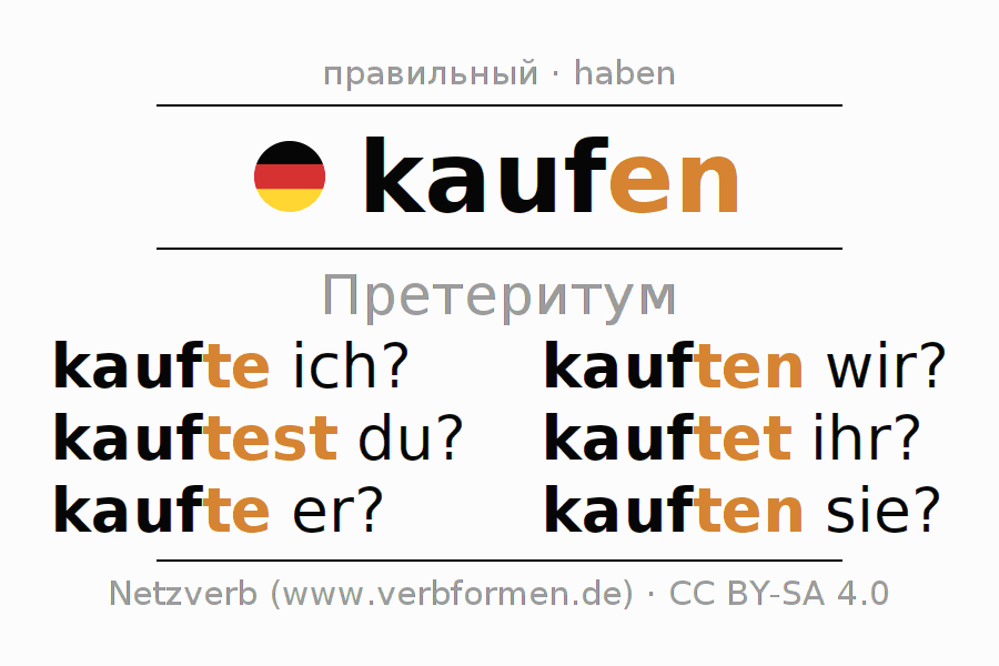 Спряжение kaufen в Претеритум Индикатив Прошлое время Действительный залог (актив): kaufte ich?, kauftest du?, kaufte er?, kauften wir?, kauftet ihr?, kauften sie?.Образование этих форм происходит по определённым грамматическим правилам. Так же спрягаются простые глагольные формы kaufen в Претеритум. 1Комментарий ☆5.0