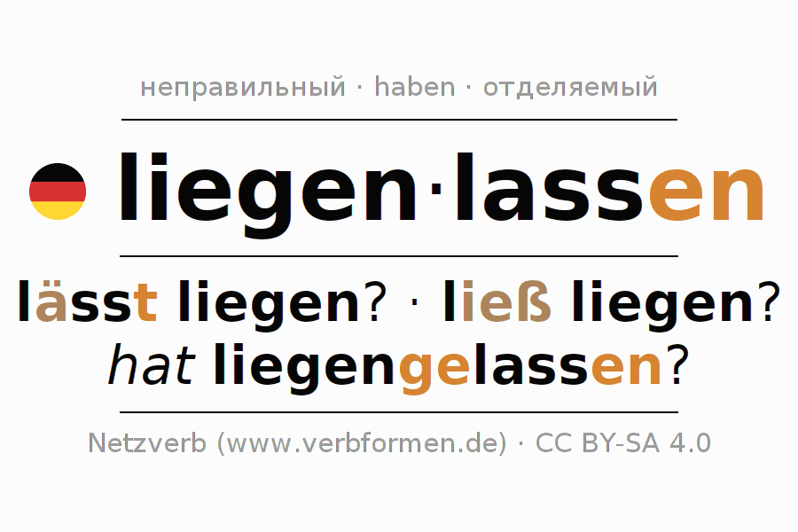 Спряжение liegenlassen в Претеритум Индикатив Прошлое время Действительный залог (актив): ließ ich liegen?, ließ(es)t du liegen?, ließ er liegen?, ließen wir liegen?, ließ(e)t ihr liegen?, ließen sie liegen?.Образование этих форм происходит по определённым грамматическим правилам. Так же спрягаются простые глагольные формы liegenlassen в Претеритум. Kомментарии ☆