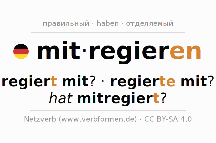 Спряжение mitregieren в Претеритум Индикатив Прошлое время Действительный залог (актив): regierte ich mit?, regiertest du mit?, regierte er mit?, regierten wir mit?, regiertet ihr mit?, regierten sie mit?.Образование этих форм происходит по определённым грамматическим правилам. Так же спрягаются простые глагольные формы mitregieren в Претеритум. Kомментарии ☆