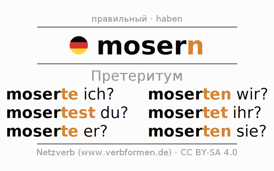 Спряжение mosern в Претеритум Индикатив Прошлое время Действительный залог (актив): moserte ich?, mosertest du?, moserte er?, moserten wir?, mosertet ihr?, moserten sie?.Образование этих форм происходит по определённым грамматическим правилам. Так же спрягаются простые глагольные формы mosern в Претеритум. Kомментарии ☆