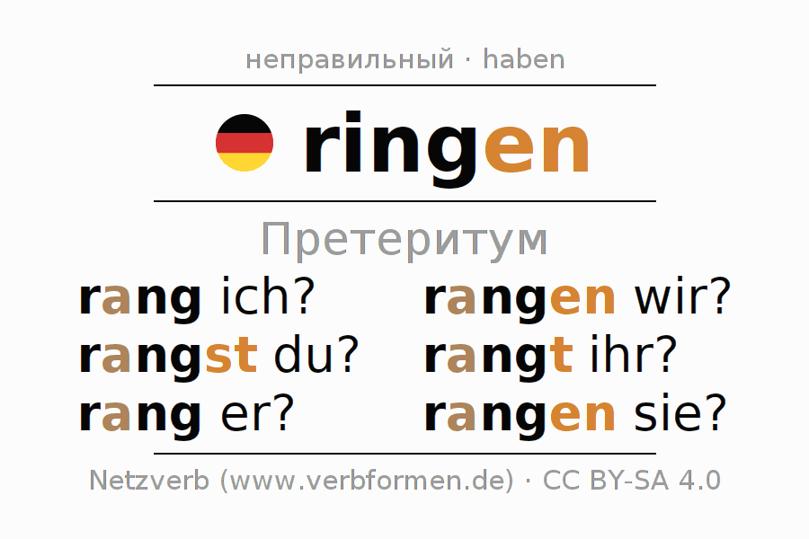 Спряжение ringen в Претеритум Индикатив Прошлое время Действительный залог (актив): rang ich?, rangst du?, rang er?, rangen wir?, rangt ihr?, rangen sie?.Образование этих форм происходит по определённым грамматическим правилам. Так же спрягаются простые глагольные формы ringen в Претеритум. Kомментарии ☆