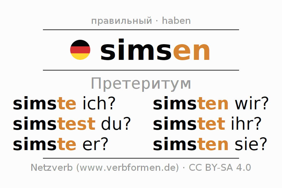 Спряжение simsen в Претеритум Индикатив Прошлое время Действительный залог (актив): simste ich?, simstest du?, simste er?, simsten wir?, simstet ihr?, simsten sie?.Образование этих форм происходит по определённым грамматическим правилам. Так же спрягаются простые глагольные формы simsen в Претеритум. Kомментарии ☆