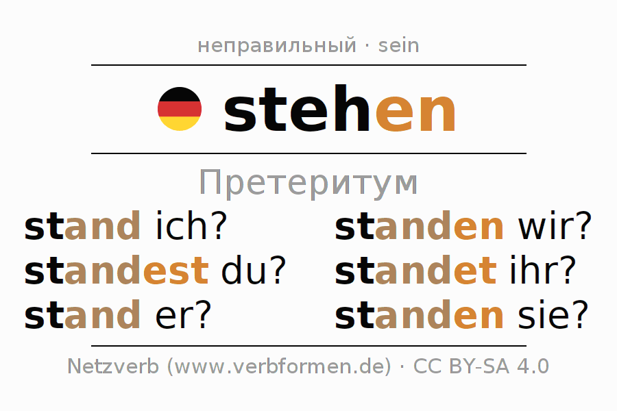Спряжение stehen в Претеритум Индикатив Прошлое время Действительный залог (актив): stand ich?, stand(e)st du?, stand er?, standen wir?, standet ihr?, standen sie?.Образование этих форм происходит по определённым грамматическим правилам. Так же спрягаются простые глагольные формы stehen в Претеритум. 2Комментарии ☆5.0