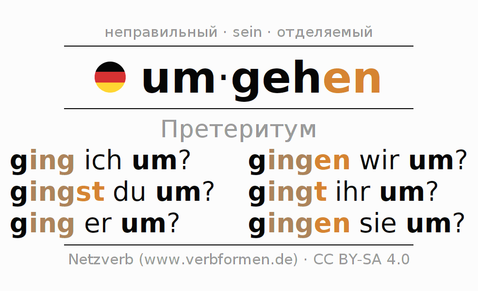 Спряжение umgehen в Претеритум Индикатив Прошлое время Действительный залог (актив): ging ich um?, gingst du um?, ging er um?, gingen wir um?, gingt ihr um?, gingen sie um?.Образование этих форм происходит по определённым грамматическим правилам. Так же спрягаются простые глагольные формы umgehen в Претеритум. Kомментарии ☆