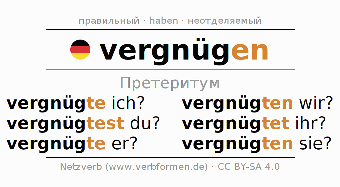 Спряжение vergnügen в Претеритум Индикатив Прошлое время Действительный залог (актив): vergnügte ich?, vergnügtest du?, vergnügte er?, vergnügten wir?, vergnügtet ihr?, vergnügten sie?.Образование этих форм происходит по определённым грамматическим правилам. Так же спрягаются простые глагольные формы vergnügen в Претеритум. Kомментарии ☆