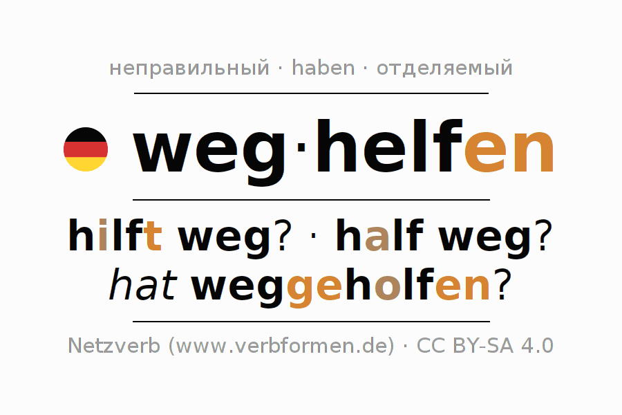 Спряжение weghelfen в Претеритум Индикатив Прошлое время Действительный залог (актив): half ich weg?, halfst du weg?, half er weg?, halfen wir weg?, halft ihr weg?, halfen sie weg?.Образование этих форм происходит по определённым грамматическим правилам. Так же спрягаются простые глагольные формы weghelfen в Претеритум. Kомментарии ☆