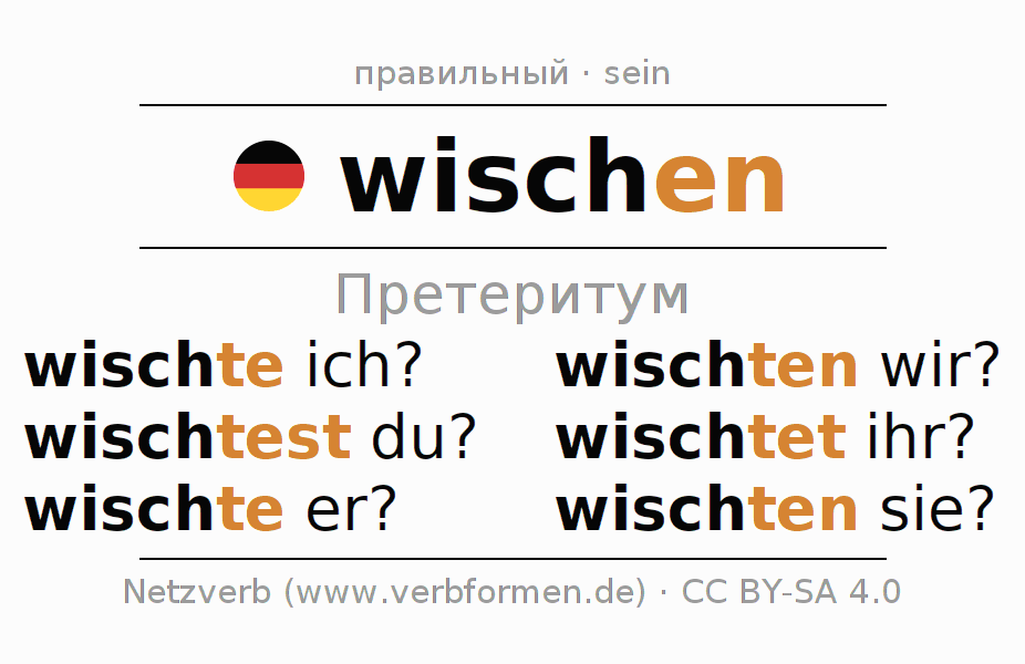 Спряжение wischen в Претеритум Индикатив Прошлое время Действительный залог (актив): wischte ich?, wischtest du?, wischte er?, wischten wir?, wischtet ihr?, wischten sie?.Образование этих форм происходит по определённым грамматическим правилам. Так же спрягаются простые глагольные формы wischen в Претеритум. Kомментарии ☆