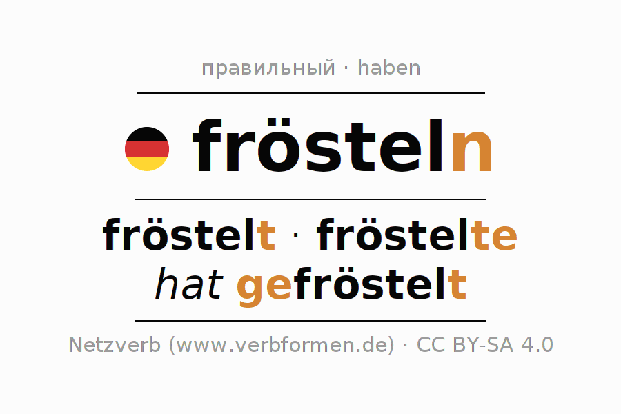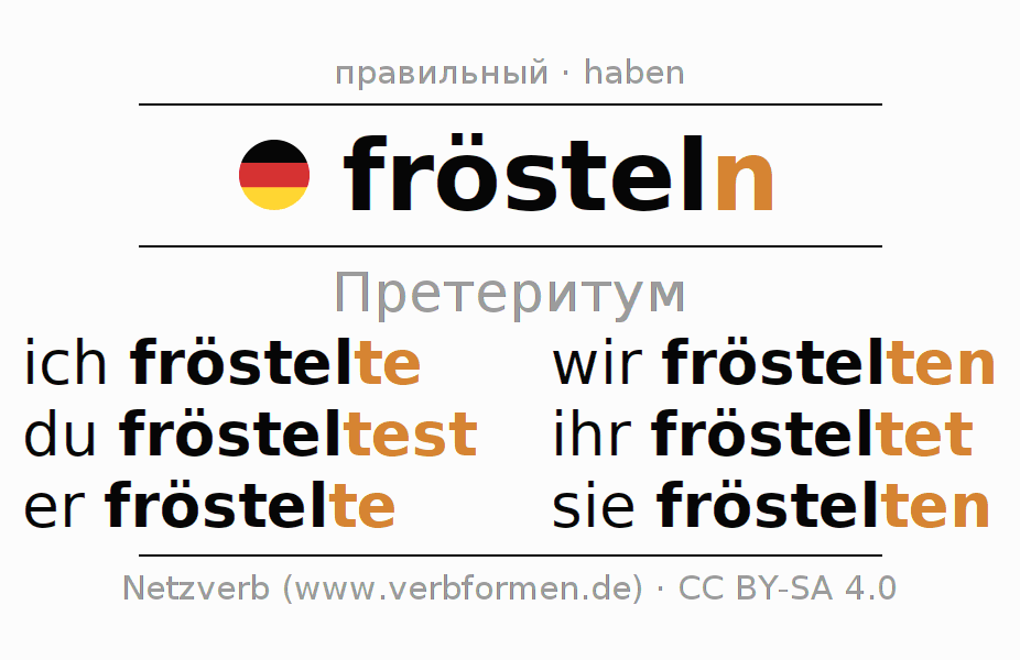 Спряжение frösteln (дрожать от холода, дрожь) в прошедшем времени претерит: ich fröstelte, du frösteltest, er fröstelte, wir fröstelten, ihr frösteltet, sie fröstelten.