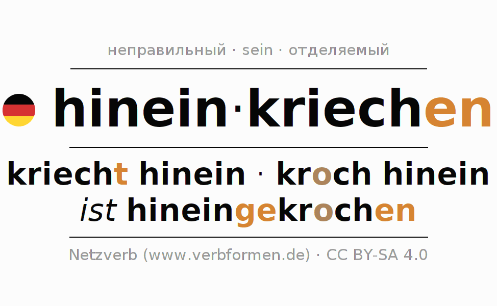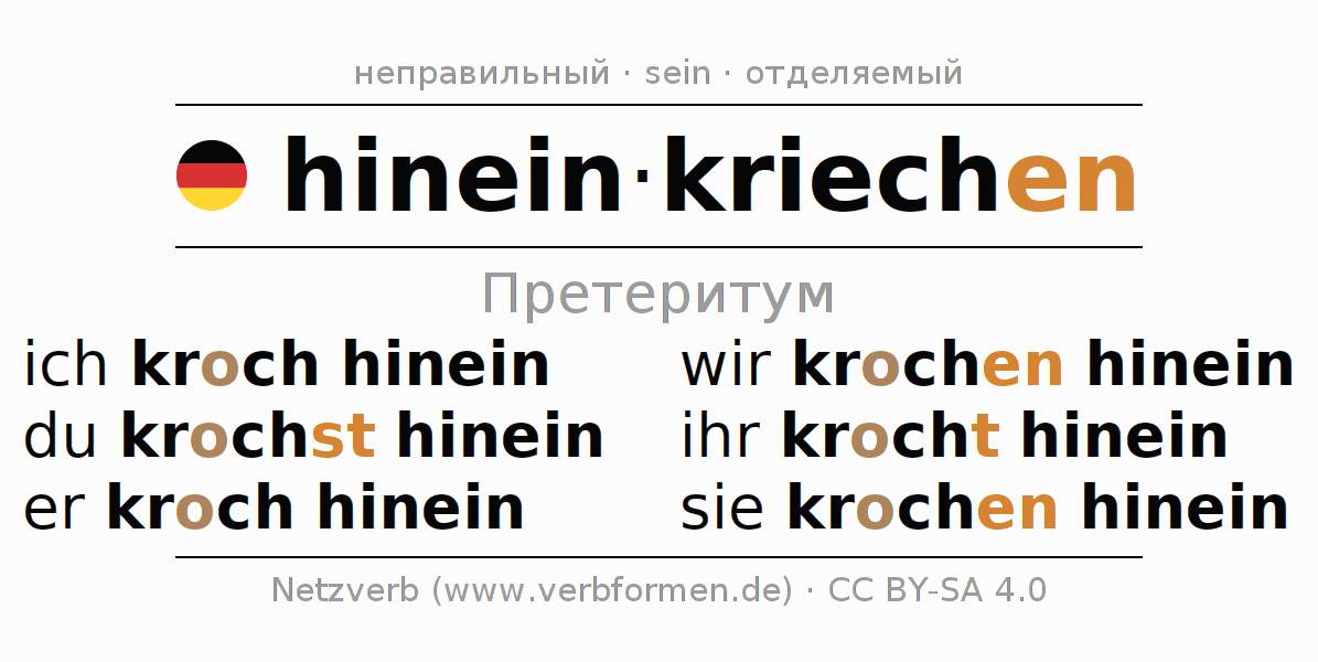 Спряжение hineinkriechen (вкратце, внутрь) в прошедшем времени претерит: ich kroch hinein, du krochst hinein, er kroch hinein, wir krochen hinein, ihr krocht hinein, sie krochen hinein.