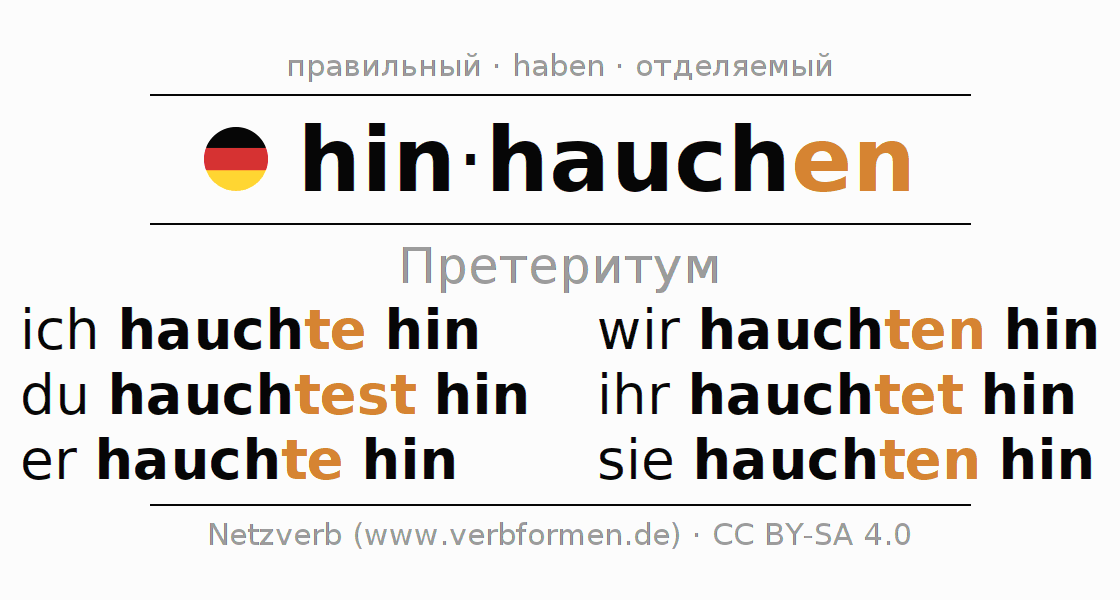 Спряжение hinhauchen (прошептать, еле слышно) в прошедшем времени претерит: ich hauchte hin, du hauchtest hin, er hauchte hin, wir hauchten hin, ihr hauchtet hin, sie hauchten hin.