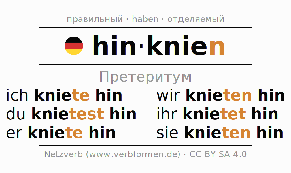 Спряжение hinknien (встать на колени, коленопреклониться) в прошедшем времени претерит: ich kniete hin, du knietest hin, er kniete hin, wir knieten hin, ihr knietet hin, sie knieten hin.