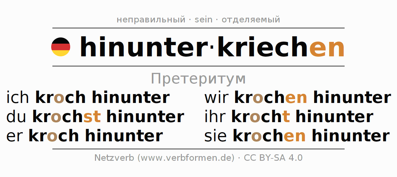 Спряжение hinunterkriechen (сползать, ползти вниз) в прошедшем времени претерит: ich kroch hinunter, du krochst hinunter, er kroch hinunter, wir krochen hinunter, ihr krocht hinunter, sie krochen hinunter.