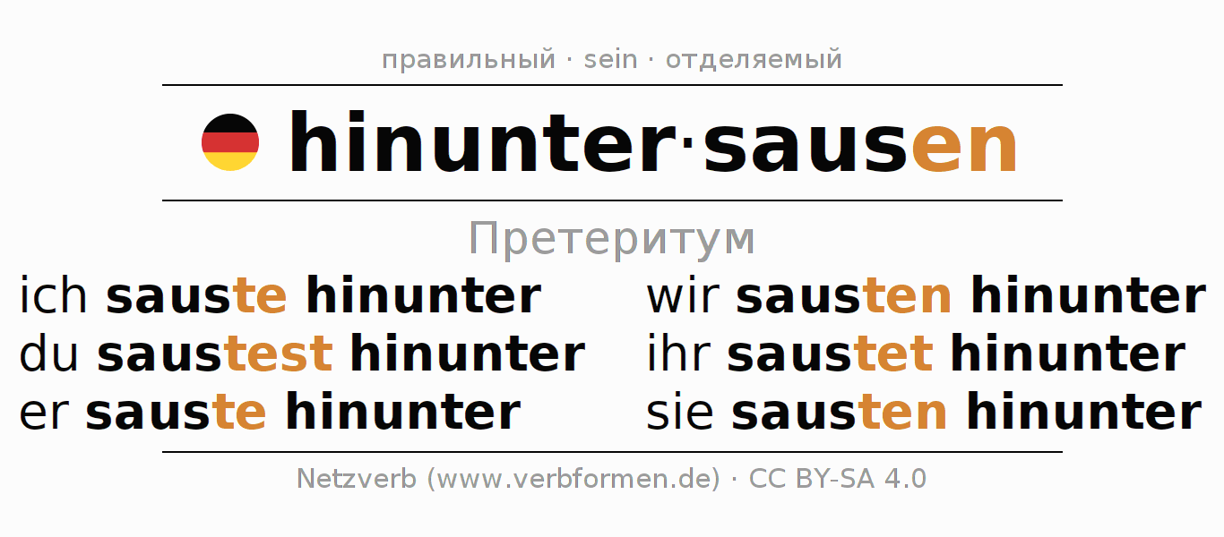 Спряжение hinuntersausen (мчаться вниз) в прошедшем времени претерит: ich sauste hinunter, du saustest hinunter, er sauste hinunter, wir sausten hinunter, ihr saustet hinunter, sie sausten hinunter.