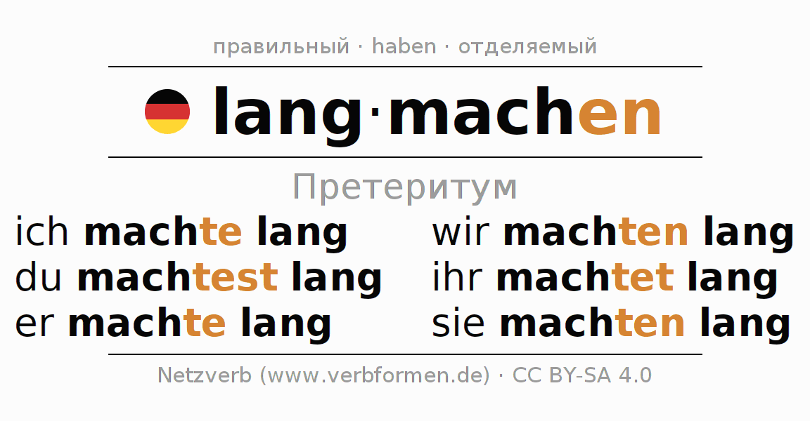 Спряжение langmachen (растягиваться, протягиваться) в прошедшем времени претерит: ich machte lang, du machtest lang, er machte lang, wir machten lang, ihr machtet lang, sie machten lang.