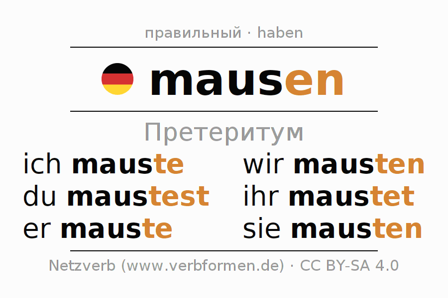 Спряжение mausen (воровать, коитус) в прошедшем времени претерит: ich mauste, du maustest, er mauste, wir mausten, ihr maustet, sie mausten.